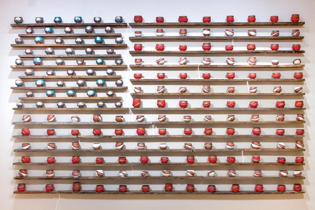 Ashlyn Pope, Birth of a Nation When Cotton Was King, 2021, brown stoneware, slip, fired to cone 5 in an electric kiln, wood, 6 feet x 11 feet x 4 inches.