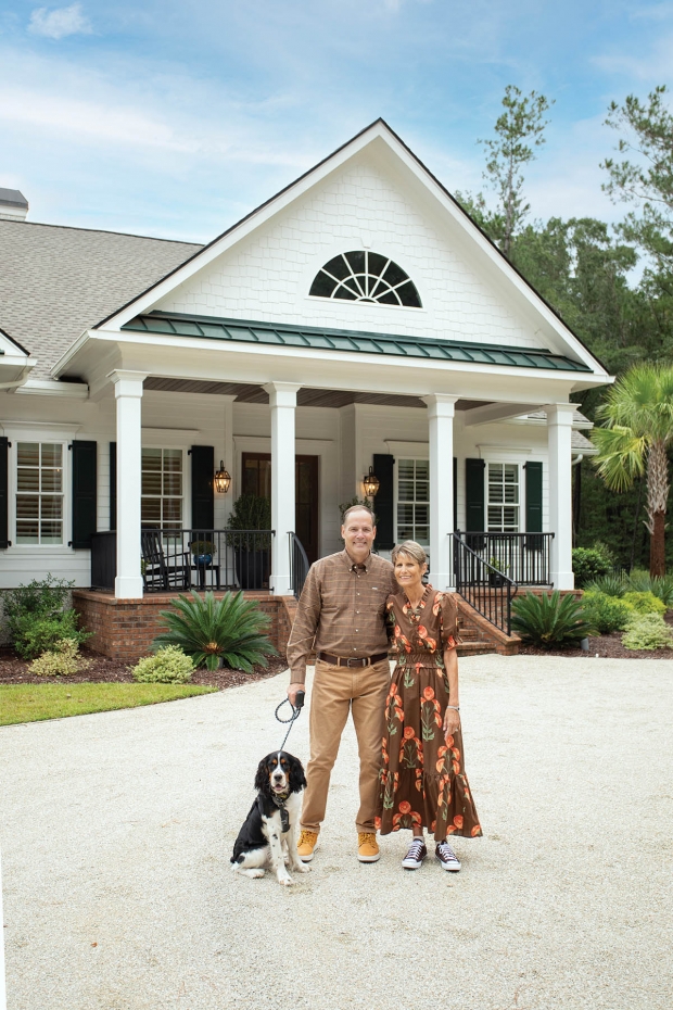 “We were looking to build an elegant, yet comfortable Southern Lowcountry classic home,” says homeowner Kent Abrahamson. “The home style was based on the [historic] Mansfield Plantation [in Georgetown, South Carolina], with the portico entrance, large porch, and supporting columns. The home also includes working shutters for historic reference.”