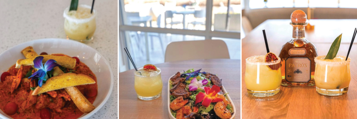 (Left) Rooted in Spain, Mexico and throughout Latin America, the popular Camarones Al Ajo, is created from a blend of jumbo shrimp, garlic chili butter, onions and cherry tomatoes. (Middle) Salt & Lime's Surf & Turf is a fusion  of salad greens, blackened beef filet tips, charred pineapple, sesame seeds, avocado, queso, chimichurri and a choice of shrimp, tuna or even chicken. (Right) House margaritas are made with a proprietary tequila blend made exclusively for Salt & Lime by Patron, the master Tequila distillers of Mexico.